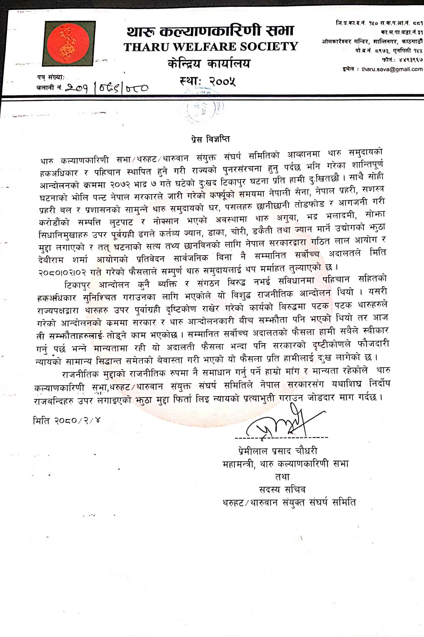 थरुहट थारुवान संयुक्त संघर्ष समिति र सरकारसँग भएको सम्झौता विपरीत फैसला आएको भन्दै टीकापुर राजबन्दीहरूउपर लगाइएको झुठा मुद्दा फिर्ता लिन माग गरेको छ। उसले पहिचानको आन्दोलनसँग जोडिएको मुद्दामा सरकारसँग टीकापुर घटनामा राजनीतिक तवरबाट समाधान गर्न माग गरेको छ।