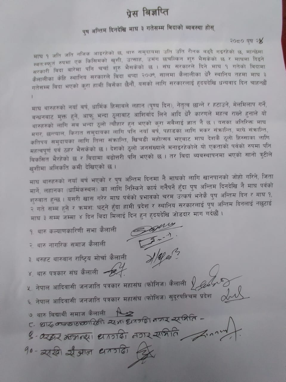 थारू कल्याणकारी सभा कैलालीका सभापति वीरबहादुर चौधरीको नेतृत्वमा गएको टोलीले माघ पर्व पुस मसान्तको अन्तिम दिनदेखि सुरु हुने भएकोले पुस अन्तिम दिनदेखि माघ ३ गतेसम्म चार दिन बिदा माग गरेको हो।