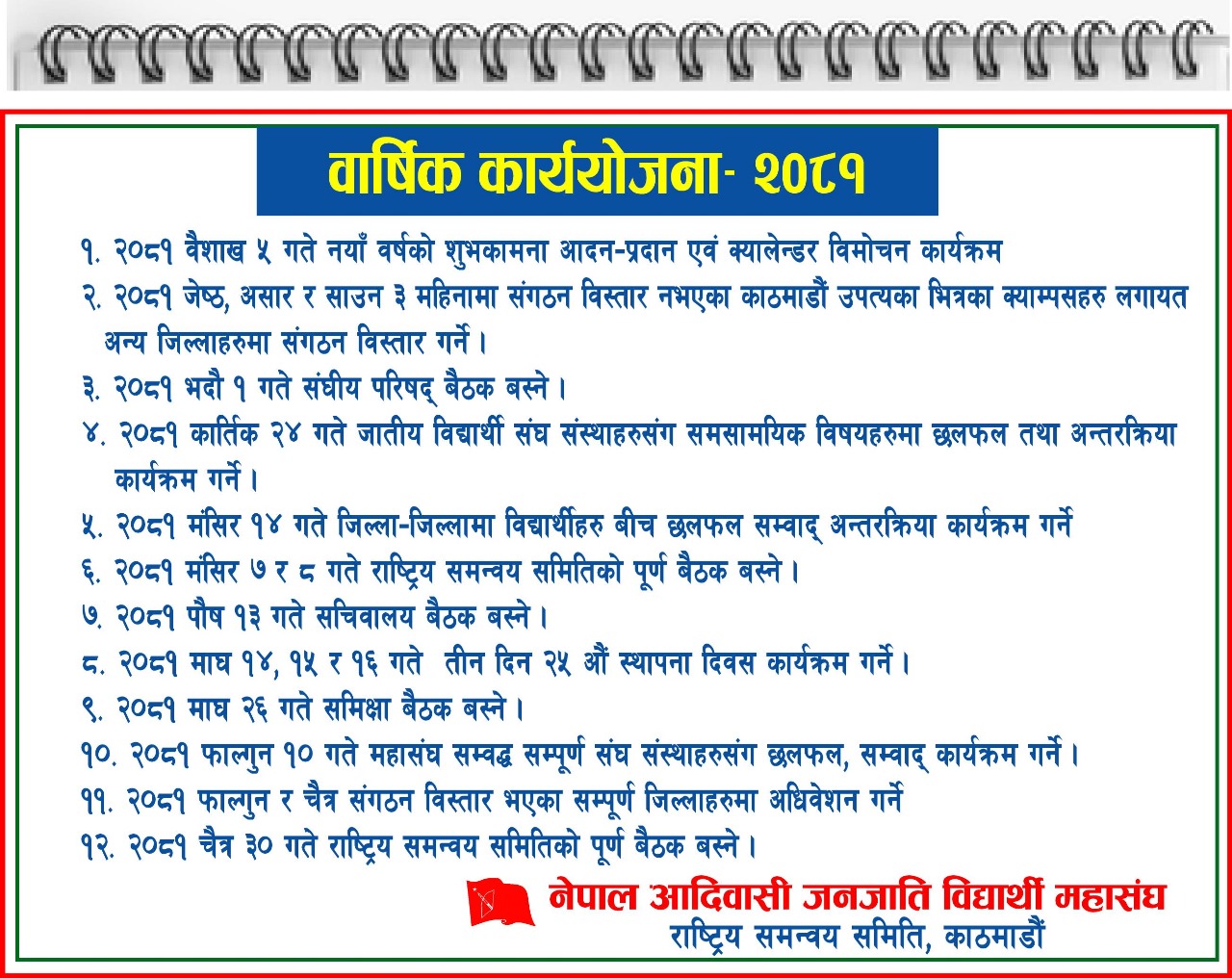 नेपाल आदिवासी जनजाति विद्यार्थी महासंघको क्यालेन्डर र वार्षिक कार्ययोजना सार्वजनिक