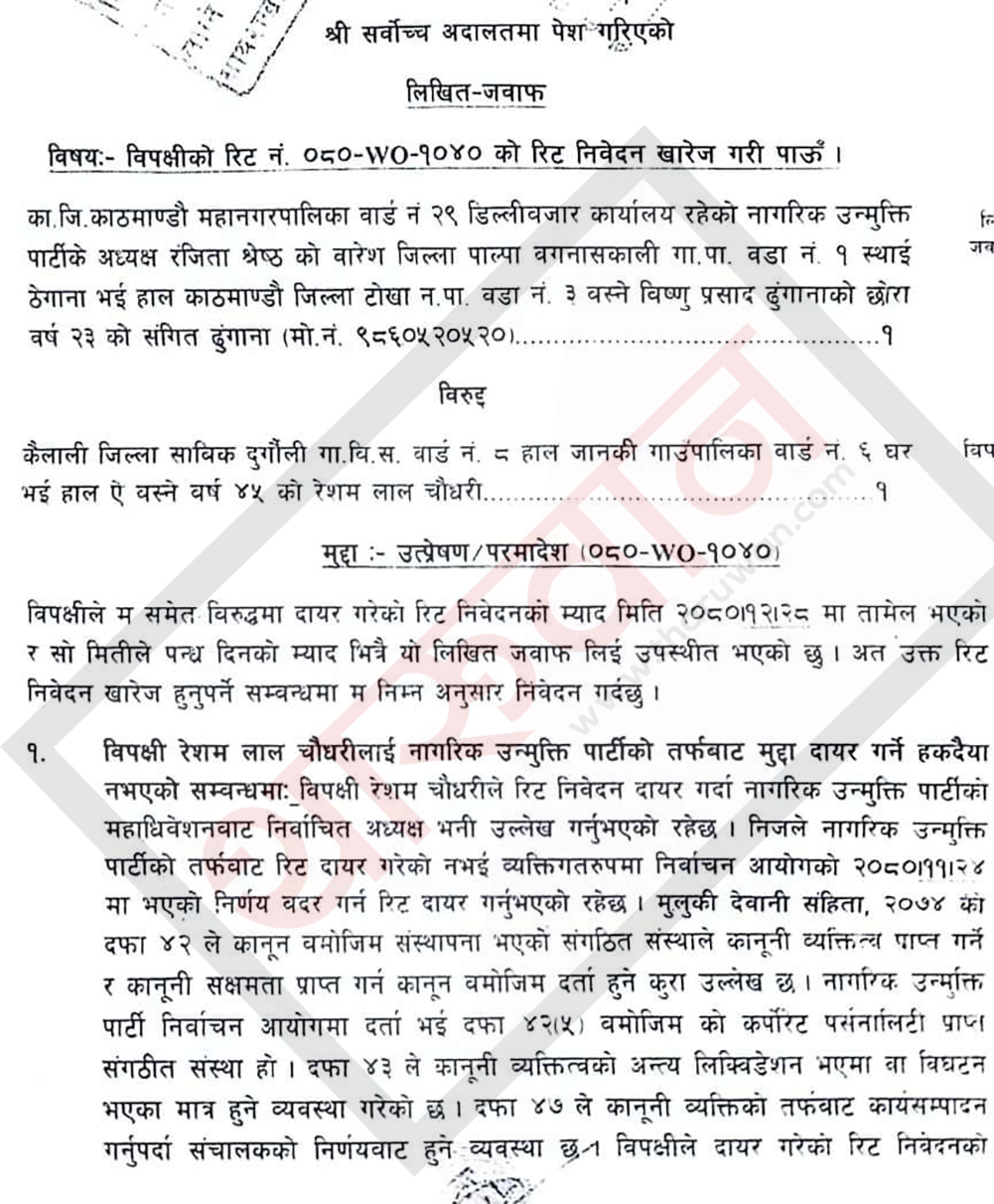१. विपक्षी रेशम लाल चौधरीलाई नागरिक उन्मुक्ति पार्टीको तर्फबाट मुद्दा दायर गर्ने हकदैया नभएको सम्बन्धमाः विपक्षी रेशम चौधरीले रिट निवेदन दायर गर्दा नागरिक उन्मुक्ति पार्टीको महाधिवेशनवाट निर्वाचित अध्यक्ष भनी उल्लेख गर्नुभएको रहेछ । निजले नागरिक उन्मुक्ति पार्टीको तर्फवाट रिट दायर गरेको नभई व्यक्तिगतरुपमा निर्वाचन आयोगको २०८०।११।२४ मा भएको निर्णय बदर गर्न रिट दायर गर्नुभएको रहेछ । मुलुकी देवानी संहिता, २०७४ को दफा ४२ ले कानून बमोजिम संस्थापना भएको संगठित संस्थाले कानूनी व्यक्तित्व प्राप्त गर्ने र कानूनी सक्षमता प्राप्त गर्न कानून वमोजिम दर्ता हुने कुरा उल्लेख छ । नागरिक उन्मुक्ति पार्टी निर्वाचन आयोगमा दर्ता भई दफा ४२(५) वमोजिम को कर्पोरेट पर्सनालिटी प्राप्त संगठीत संस्था हो । दफा ४३ ले कानूनी व्यक्तित्वको अन्त्य लिक्विडेशन भएमा वा विघटन भएका मात्र हुने व्यवस्था गरेको छ । दफा ४७ ले कानूनी व्यक्तिको तर्फबाट कार्यसम्पादन गर्नुपर्दा संचालकको निर्णयबाट हुने व्यवस्था छ -1 विपक्षीले दायर गरेको रिट निवेदनको समुच्चम दावी हेदा नागरिक उन्मुक्ति पार्टीको अध्यक्ष पदमा आफ्नो बहालीको माग नभई कथित महाधिवेशनबाट विधान विपरित निर्वाचित सबै पदाधिकारीको तर्फबाट समेत निज स्वयं रिट दिएको देखिन्छ । अन्य व्यक्तिको वारेश नलिई वा संस्थाको तर्फबाट अधिकार प्राप्त नगरी संस्थाको तर्फबाट रिट दायर गर्ने अधिकार विपक्षीलाई नभएको हुँदा हकदैया विहिन रिट खारेज गरी पाउँ ।