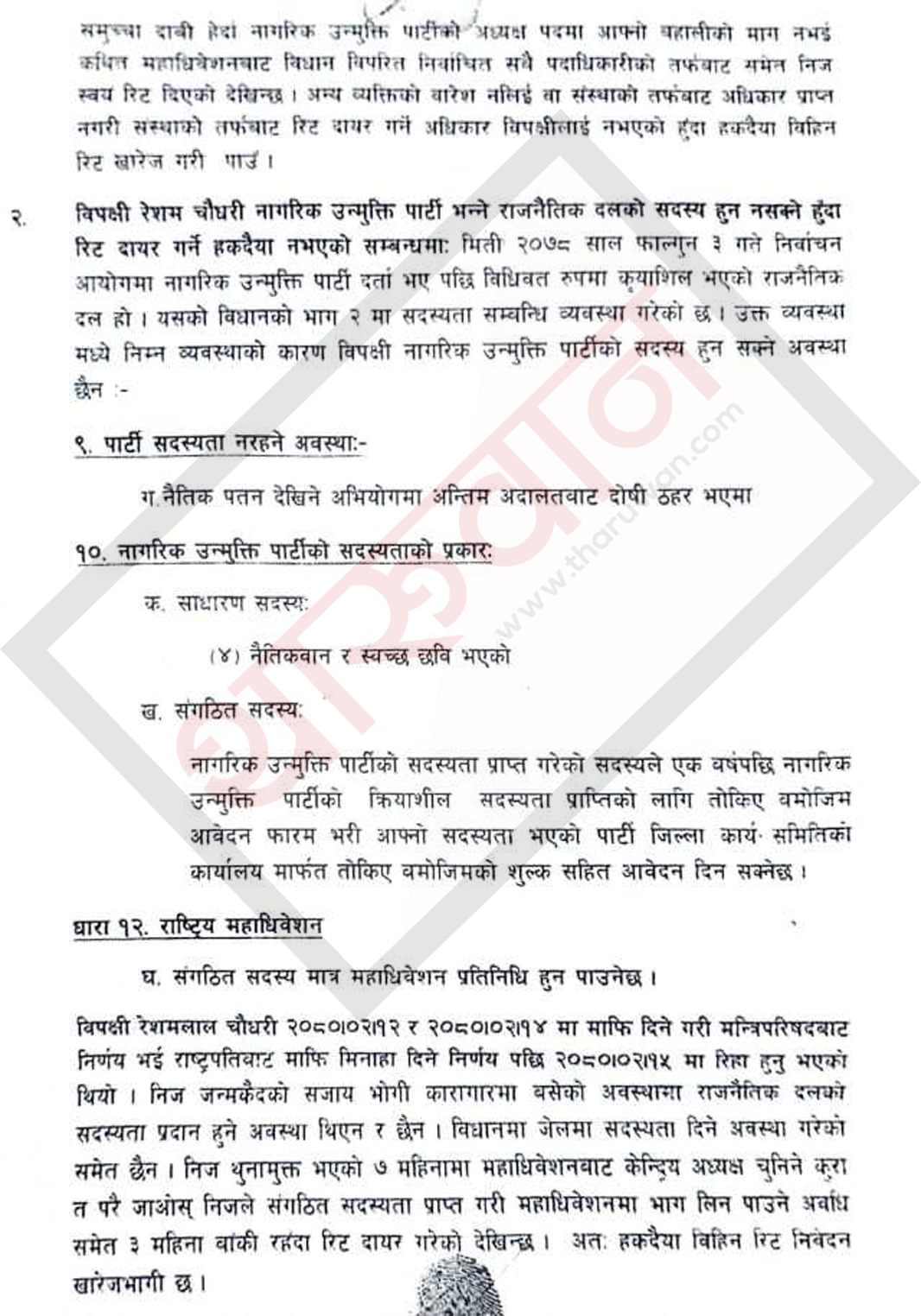 २. विपक्षी रेशम चौधरी नागरिक उन्मुक्ति पार्टी भन्ने राजनैतिक दलको सदस्य हुन नसक्ने हुँदा रिट दायर गर्ने हकदैया नभएको सम्बन्धमाः मिती २०७८ साल फाल्गुन ३ गते निर्वाचन आयोगमा नागरिक उन्मुक्ति पार्टी दर्ता भए पछि विधिवत रुपमा कृयाशिल भएको राजनैतिक दल हो । यसको विधानको भाग २ मा सदस्यता सम्बन्धि व्यवस्था गरेको छ । उक्त व्यवस्था मध्ये निम्न व्यवस्थाको कारण विपक्षी नागरिक उन्मुक्ति पार्टीको सदस्य हुन सक्ने अवस्था छैन :-