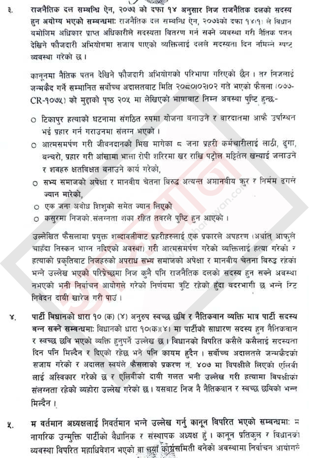 ४. पार्टी विधानको धारा १० (क) (४) अनुरुप स्वच्छ छबि र नैतिकवान व्यक्ति मात्र पार्टी सदस्य बन्न सक्ने सम्बन्धमाः विधानको धारा १०( क ) ( ४ ) मा पार्टीको साधारण सदस्य हुन नैतिकवान र स्वच्छ छवि भएको व्यक्ति हुनुपर्ने उल्लेख छ । विधानको विपरित कसैले कसैलाई सदस्यता दिन पनि मिल्दैन र दिएको रहेछ भने पनि कायम हुदैन । सर्वोच्च अदालतले जन्मकैदको सजाय गरेको र अदालत स्वयंले फैसलाको प्रकरण नं. ४०७ मा विपक्षीले लिएको एलिवी लाई अस्विकार गरेको छ र एलिवीको दावी गलत भनी उल्लेख गरी हत्यामा विपक्षीको संलग्नता रहेको व्यहोरा उल्लेख गरेको छ । यसबाट निज नै नैतिकवान र स्वच्छ छविको भन्न मिल्दैन।