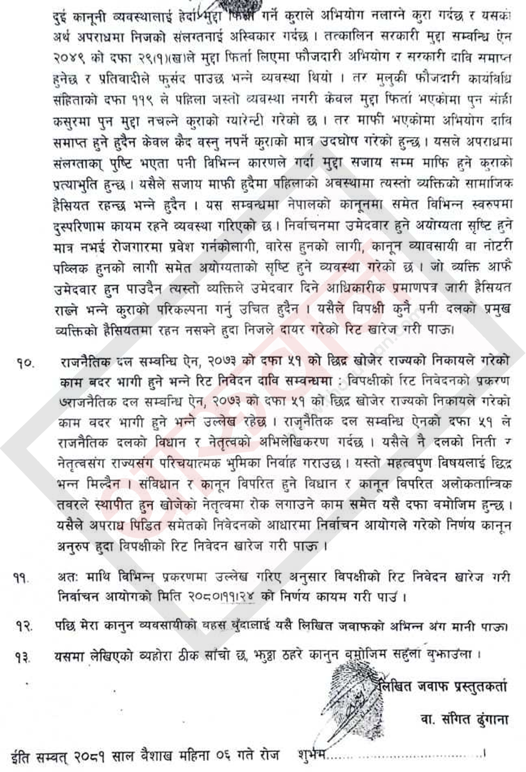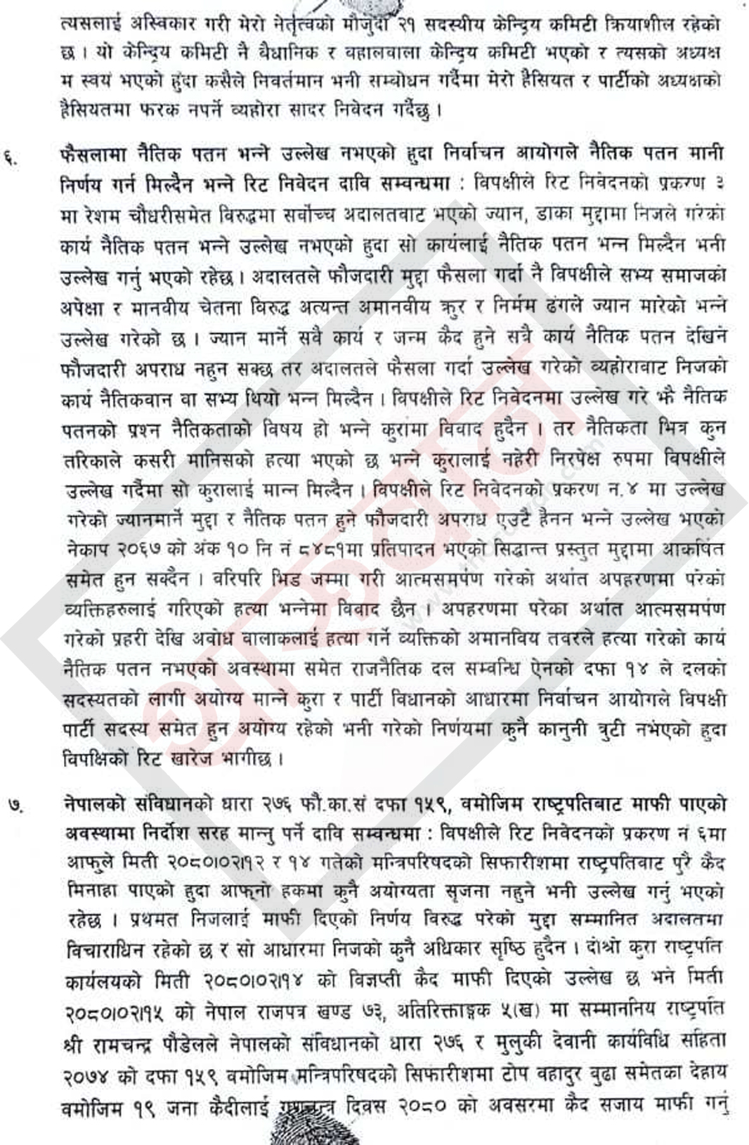 ९. मुद्दा फिर्ता र माफीको भिन्नता सम्वन्धमा : राजनैतिक दलको नेता भएको व्यक्ति निर्वाचनमा उमेदवार हुनै नपाउने अवस्थाको परिकल्पना गर्न सकिदैन । प्रतिनिधिसभा निर्वाचन ऐन २०७४, प्रदेश सभा सदस्य निर्वाचन ऐन २०७४ र स्थानिय तह निर्वाचन ऐन २०७३ ले उमेरवारको अयोग्यता निर्धारण गरेको छ । जसमा जन्म कैद भएको व्यक्ति समेत उमेदार हुन नपाउने उल्लेख छ । राजनैतिक दलको अध्यक्ष पदमा आफै उमेदवार हुन अयोग्य व्यक्ति रहने र उसैले उमेदवारको औपचारिक पत्रमा हस्ताक्षर गर्ने वा दलको तर्फवाट टिकट दिने व्यक्ति हुन सक्छ भन्ने व्यवस्था कानूनमा गरिएको छैन र हैन । तत्कालिन माफि मुद्दा फिर्ता दुई कानूनी व्यवस्थालाई हेर्दा मुद्दा किसी गर्ने कुराले अभियोग नलाग्ने कुरा गर्दछ र यसको अर्थ अपराधमा निजको संलग्तनाई अस्विकार गर्दछ । तत्कालिन सरकारी मुद्दा सम्बन्धि ऐन २०४९ को दफा २९(१)(ख) ले मुद्दा फिर्ता लिएमा फौजदारी अभियोग र सरकारी दावि समाप्त हुनेछ र प्रतिवादीले फुर्सद पाउछ भन्ने व्यवस्था थियो । तर मुलुकी फौजदारी कार्याविधि संहिताको दफा ११९ ले पहिला जस्तो व्यवस्था नगरी केवल मुद्दा फिर्ता भएकोमा पुन सोही कसुरमा पुन मुद्दा नचल्ने कुराको ग्यारेन्टी गरेको छ । तर माफी भएकोमा अभियोग दावि समाप्त हुने हुदैन केवल कैद वस्नु नपर्ने कुराको मात्र उदघोष गरेको हुन्छ । यसले अपराधमा संलग्ताका पुष्टि भएता पनी विभिन्न कारणले गर्दा मुद्दा सजाय सम्म माफि हुने कुराको प्रत्याभुति हुन्छ । यसैले सजाय माफी हुदैमा पहिलाको अवस्थामा त्यस्तो व्यक्तिको सामाजिक हैसियत रहन्छ भन्ने हुदैन । यस सम्बन्धमा नेपालको कानूनमा समेत विभिन्न स्वरुपमा दुस्परिणाम कायम रहने व्यवस्था गरिएको छ । निर्वाचनमा उमेदवार हुने अयोग्यता सृष्टि हुने मात्र नभई रोजगारमा प्रवेश गर्नकोलागी, वारेस हुनको लागी कानून व्यावसायी वा नोटरी पव्लिक हुनको लागी समेत अयोग्यताको सृष्टि हुने व्यवस्था गरेको छ । जो व्यक्ति आफै उमेदवार हुन पाउदैन त्यस्तो व्यक्तिले उमेदवार दिने आधिकारीक प्रमाणपत्र जारी हैसियत राख्ने भन्ने कुराको परिकल्पना गर्नु उचित हुदैन । यसैले विपक्षी कुनै पनी दलको प्रमुख व्यक्तिको हैसियतमा रहन नसक्ने हुदा निजले दायर गरेको रिट खारेज गरी पाऊ।