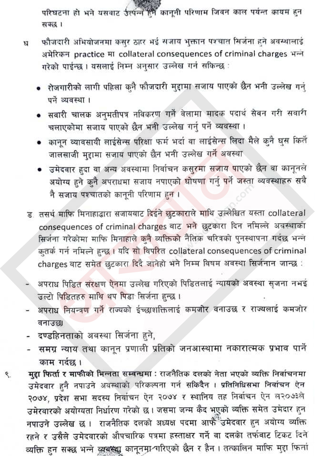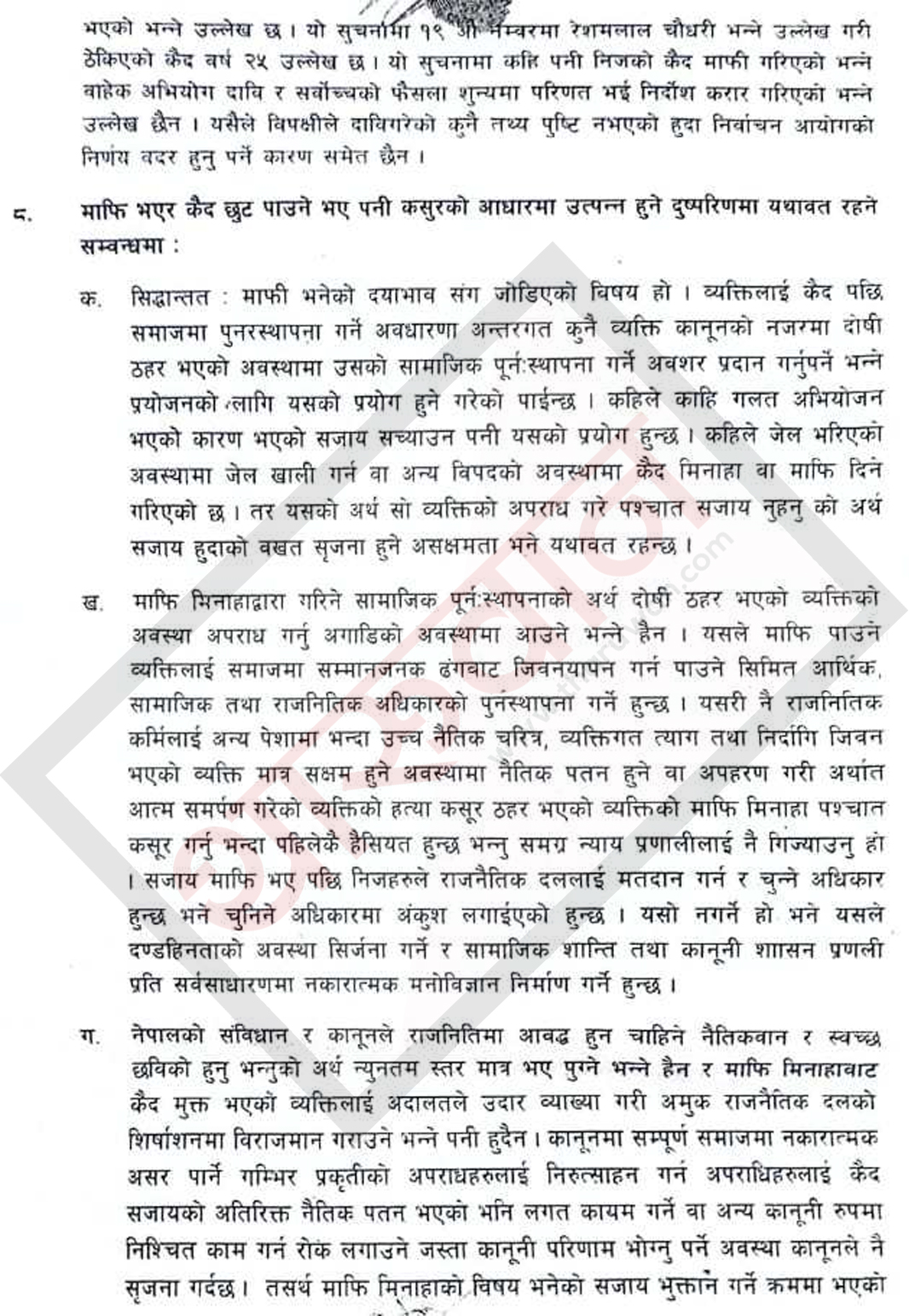 ग. नेपालको संविधान र कानूनले राजनीतिमा आवद्ध हुन चाहिने नैतिकवान र स्वच्छ छविको हुनु भन्नुको अर्थ न्युनतम स्तर मात्र भए पुग्ने भन्ने हैन र माफि मिनाहावाट कैद मुक्त भएको व्यक्तिलाई अदालतले उदार व्याख्या गरी अमुक राजनैतिक दलको शिर्षाशनमा विराजमान गराउने भन्ने पनी हुदैन। कानूनमा सम्पूर्ण समाजमा नकारात्मक असर पार्ने गम्भिर प्रकृतीको अपराधहरुलाई निरुत्साहन गर्न अपराधिहरुलाई कैद सजायको अतिरिक्त नैतिक पतन भएको भनि लगत कायम गर्ने वा अन्य कानूनी रुपमा निश्चित काम गर्न रोक लगाउने जस्ता कानूनी परिणाम भोग्नु पर्ने अवस्था कानूनले नै सृजना गर्दछ । तसर्थ माफि मिनाहाको विषय भनेको सजाय भुक्तान गर्ने क्रममा भएको परिघटना हो भने यसवाट उत्पन्न हुने कानूनी परिणाम जिवन काल पर्यन्त कायम हुन सक्छ ।