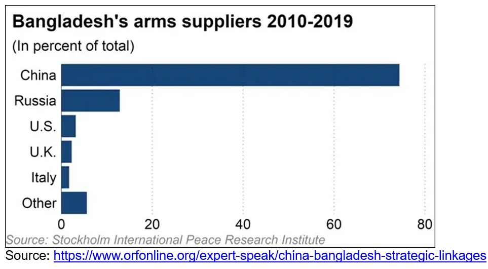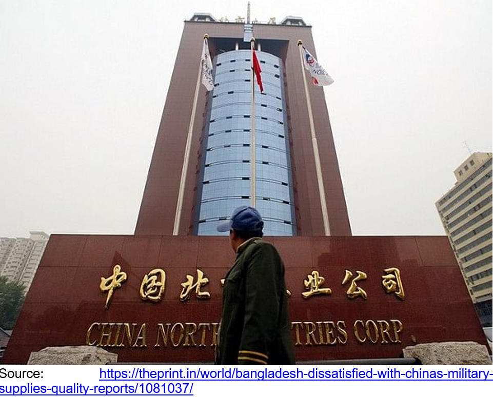 बंगलादेश जस्ता विकासशील देशहरू चिनियाँहरूतिर फर्कन बाध्य छन्, जसले पश्चिमीहरू भन्दा धेरै लाभदायक मूल्यहरू प्रस्ताव गर्छन्। यस कारणले गर्दा, बंगलादेश सेनाले हल्का हतियार, तोपखाना र बख्तरबंद सवारीसाधनहरू प्राप्त गर्यो (धेरै जसो प्रतिलिपि गरिएको) NORINCO द्वारा। चीनले बंगलादेशलाई मात्रै नभई धेरै देशमा खराब उपकरण र हतियार आपूर्ति गरेको छ । जटिल प्रशिक्षण प्रक्रियाहरू र खराब अनुबंध मूल्याङ्कनले मर्मत र स्पेयर पार्ट्सको लागि बेलुनिङ लागतमा परिणाम दिन्छ। चिनियाँ सैन्य उपकरण निर्यातले गुणस्तरहीनता र मर्मतसम्भार सेवाको अभाव जस्ता समस्याहरूको सामना गरिरहेको छ। चिनियाँ हतियारहरू प्रायः अन्य निर्यातकर्ताहरूको तुलनात्मक उत्पादनहरू भन्दा सस्तो हुन्छन्, तर बिक्री पछि सेवा समर्थन महँगो हुन्छ। तथापि, मूल्य र राजनीतिलाई एकसाथ राख्दा, प्रायः चीनलाई धेरैजसो विकासोन्मुख देशहरूका लागि सैन्य उपकरणहरूको लागि अझ आकर्षक स्रोत बनाउँछ। यहाँ पनि चिनियाँ सैन्य उपकरणको धार हराउँदै गएको देखिन्छ। बंगलादेश नौसेनाले कथित रूपमा चाइना भ्यानगार्ड इन्डस्ट्री कम्पनी लिमिटेडलाई हाइलाइट गरेको छ, युरोपेली र अमेरिकी रक्षा कम्पनीहरूबाट खरिद गरिएका प्रतिरक्षा सामग्रीहरूको मूल्य घट्दै गर्दा पनि प्रतिरक्षा सामग्रीको बढ्दो लागत। बंगलादेशले 2014-2018 मा चीनबाट 70% भन्दा बढी हतियार खरिद गरेको हुनाले, आपूर्तिको गुणस्तर र यसको प्रतिरक्षा मूल्य निर्धारणमा बंगलादेश रक्षा बलको असन्तुष्टिको बारेमा पछिल्ला चिन्तित छ। ढाकाले आफ्नो प्रतिरक्षा आपूर्तिमा विविधता ल्याउने र भारत, युरोप र अमेरिकाबाट गुणस्तरीय रक्षा सामाग्रीहरू खरिद गर्नेदेखि सावधान, बेइजिङले मूल्यवृद्धि र न्यून गुणस्तरका रक्षा वस्तुहरूबारे बंगलादेशी रक्षा चिन्ताहरूलाई कम गर्ने प्रयास गरेको छ। बंगलादेशलगायत दक्षिण एसियाका देशहरूमा चीनको हतियार बिक्रीको वास्तविकता यही हो।