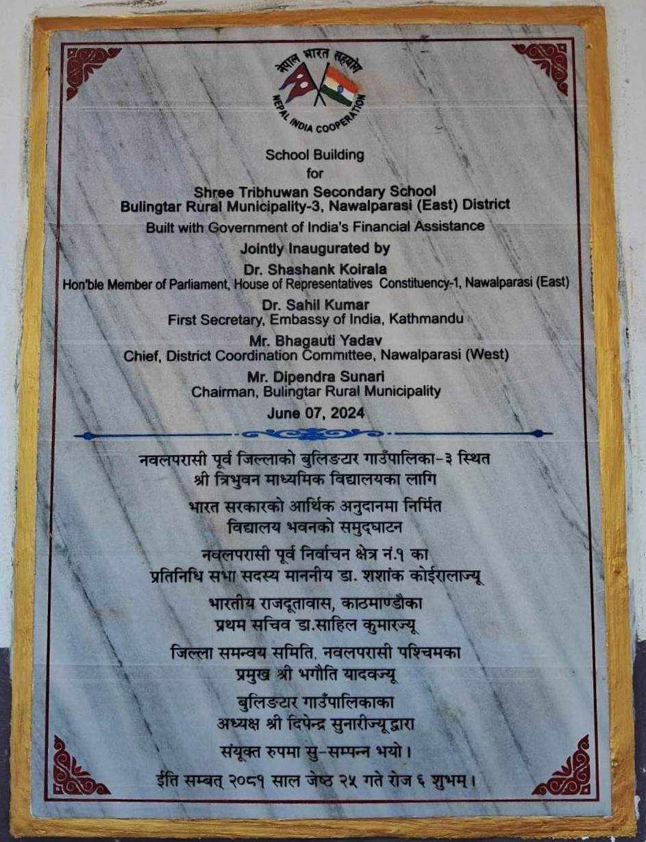 भारत सरकारद्वारा निर्मित नवलपरासी (पूर्व) को बुलिङटार गाउँपालिकास्थित श्री त्रिभुवन माध्यमिक विद्यालयको विद्यालय भवनको उद्घाटन गरिएको छ। प्रतिनिधिसभा सांसद शशांक कोइराला, जिल्ला समन्वय समितिका प्रमुख भगौती यादव, बुलिङटार गाउँपालिकाका अध्यक्ष दीपेन्द्र सुनारी र काठमाडौंस्थित भारतीय राजदूतावासका प्रथम सचिव डा. साहिल कुमारले संयुक्तरूपमा उद्घाटन गरेका हुन्।