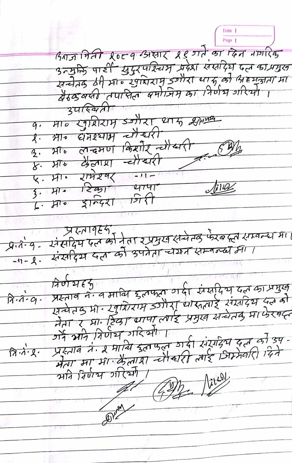 खुशीराम चौधरी, लक्ष्मण किशोर चौधरी, कैलाश चौधरी र टिका थापाले हस्ताक्षर गरेको उक्त निर्णयमा घनश्याम चौधरी, इन्दिरा गिरी र रामेश्वर चौधरीको हस्ताक्षर छैन।