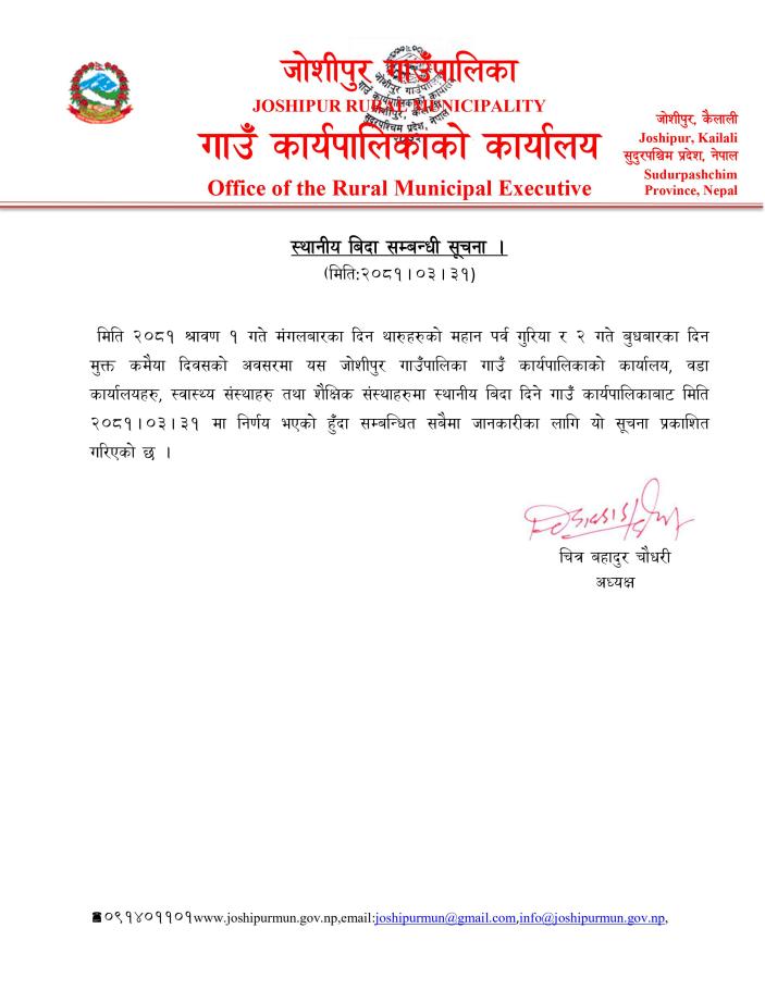 जोशीपुर गाउँपालिकाका अध्यक्ष चित्रबहादु चौधरीले पात्रोलाई पत्याउँदा गल्ती भएको स्वीकार गरे। गाउँपालिकाको बैठकमा वडाध्यक्षहरूको सल्लाहमै विदा दिने निर्णय भएको उनले थारुवानलाई बताए। ‘पात्रोमा गुरही/गुरिया पर्व लेखिएको थियो। पात्रलाई पत्याउँदा गल्ती हुन पुग्यो। विज्ञप्ति सच्याउन भनिसकेका छौं। सायद सच्चिन्छ,’ उनले भने। यो समाचार तयार पार्दासम्म जोशीपुर गाउँपालिकाको फेसबुक र वेवसाइट दुवैबाट विज्ञप्ति हटाइएको छैन, न सच्याइएको नै छ।