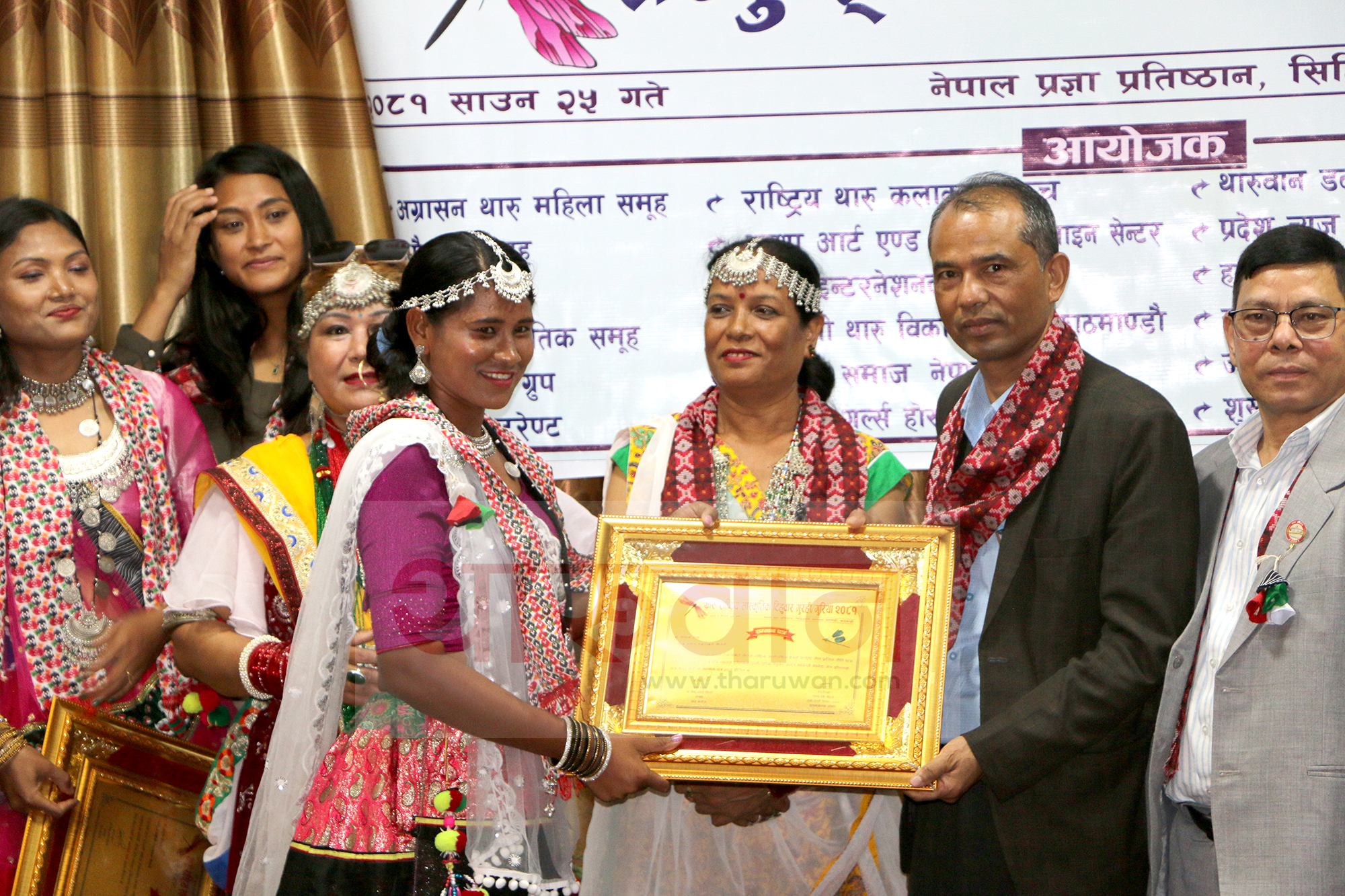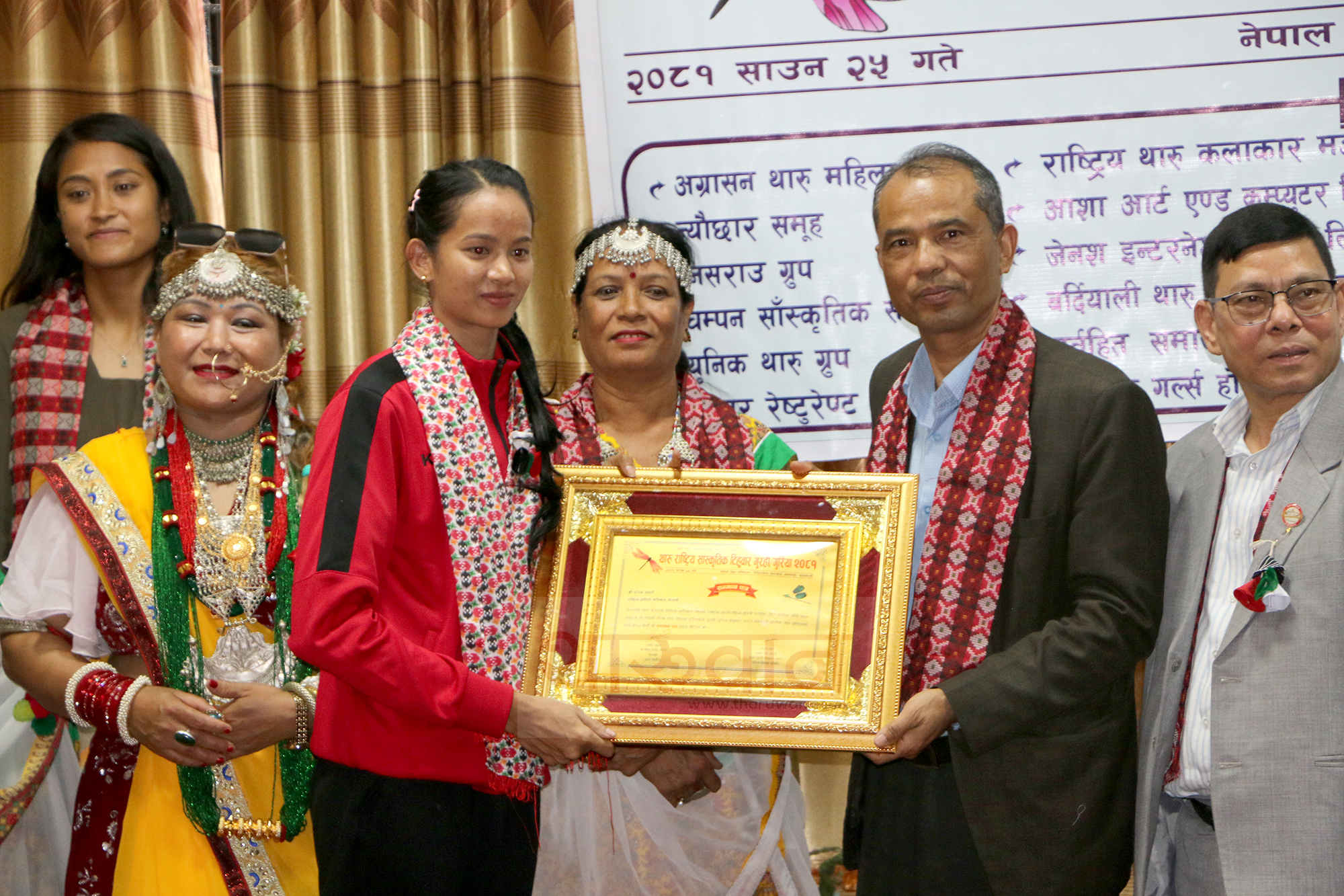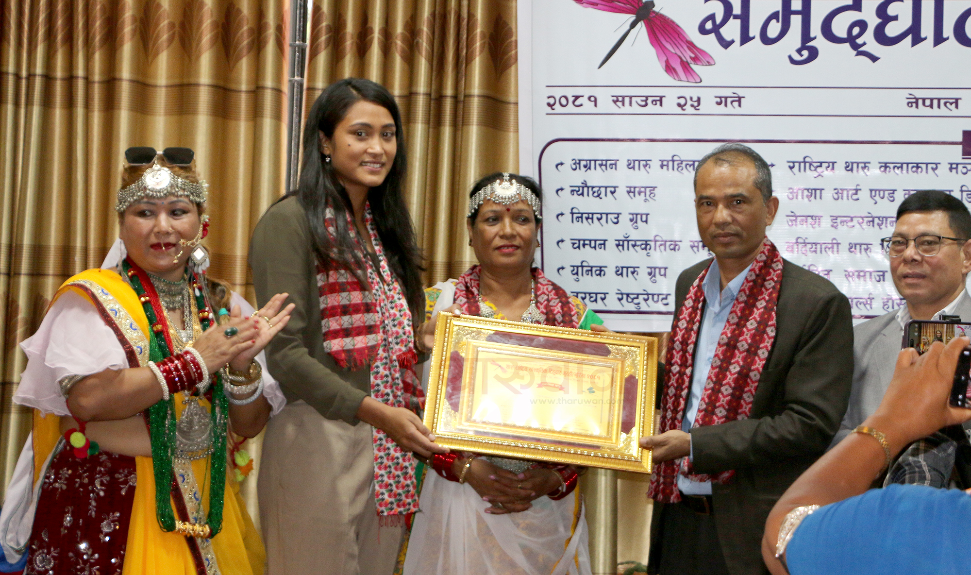 काठमाडौं : विभिन्न खेलमार्फत देशलाई चिनाउने थारू समुदायकी महिला खेलाडीहरू सम्मानित भएका छन्। काठमाडौंमा रहेका विभिन्न संघसंस्थाहरूद्वारा आयोजित गुरही पर्वको अवसरमा उनीहरूलाई सम्मान गरिएको हो।