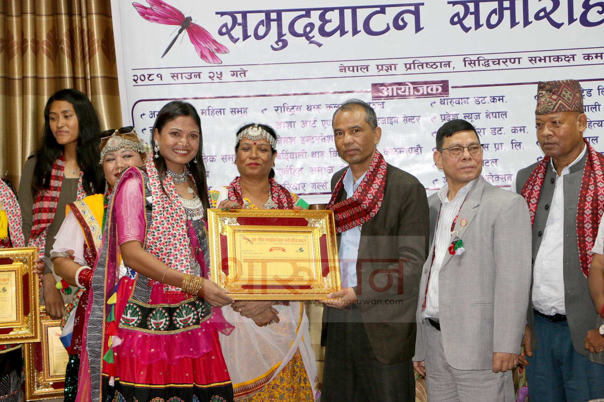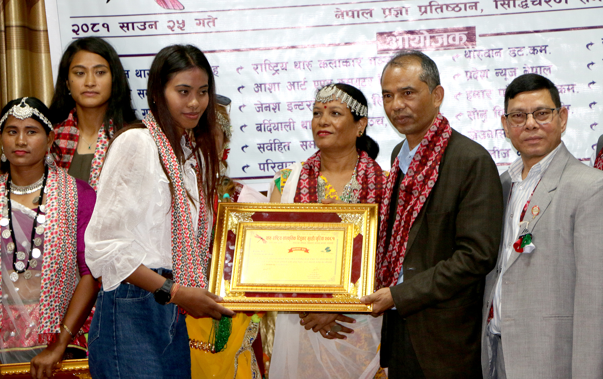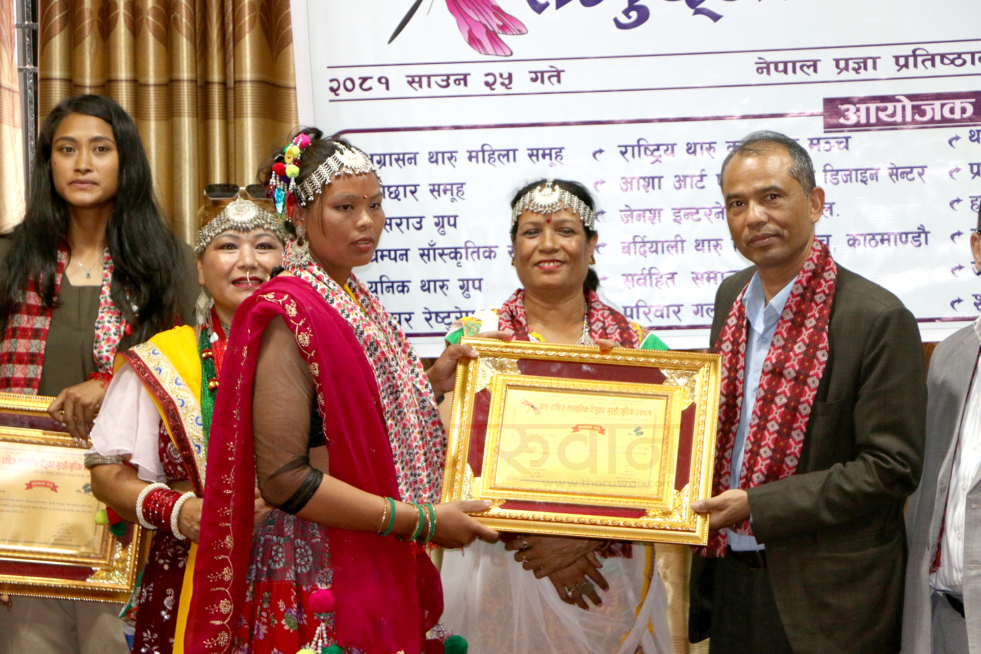 काठमाडौं : विभिन्न खेलमार्फत देशलाई चिनाउने थारू समुदायकी महिला खेलाडीहरू सम्मानित भएका छन्। काठमाडौंमा रहेका विभिन्न संघसंस्थाहरूद्वारा आयोजित गुरही पर्वको अवसरमा उनीहरूलाई सम्मान गरिएको हो।
