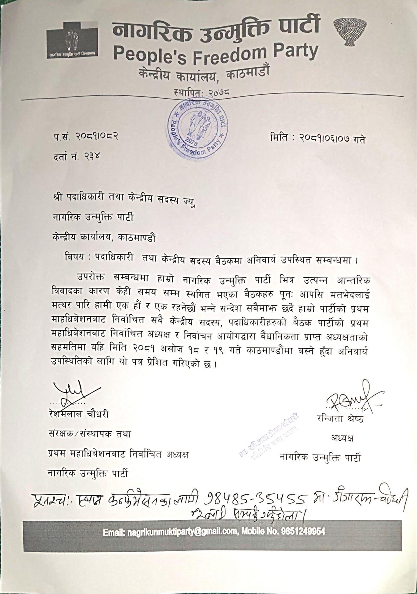 ‘उपरोक्त सम्बन्धमा हाम्रो नागरिक उन्मुक्ति पार्टीभित्र उत्पन्न आन्तरिक विवादका कारण केही समयसम्म स्थगित भएका बैठकहरू पुनः आपसी मतभेदलाई मत्थर पारी ‘हामी एक हौं र एक रहनेछौं’ भन्ने सन्देश सबैमाझ छर्दै हाम्रो पार्टीको प्रथम माहधिवेशनबाट निर्वाचित सबै केन्द्रीय सदस्य, पदाधिकारीहरूको बैठक पार्टीको प्रथम महाधिवेशनबाट निर्वाचित अध्यक्ष र निर्वाचन आयोगद्वारा वैधानिकता प्राप्त अध्यक्षताको सहमतिमा काठमाडौंमा बस्ने हुँदा अनिवार्य उपस्थितिको लागि यो पत्र प्रेशित गरिएको छ,’ पत्रमा भनिएको छ।