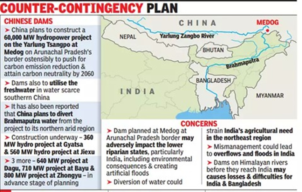 अरुणाचल प्रदेशसँगको अन्तर्राष्ट्रिय सीमापार चीनले भारतको ब्रह्मपुत्र भनेर चिनिने यार्लुङ साङ्पो नदीको ग्रेट बेन्डमा विश्वको सबैभन्दा ठूलो जलविद्युत आयोजना निर्माण गर्ने तयारी गरिरहेको छ । यो ६० GW मेटोउ मेगा बाँध हो जसले चीनले यार्लुङ त्साङ्पोमा निर्माण गरेको अन्य बाँधहरूको शृङ्खलामा थपिनेछ। यो “सबै बाँधहरूको आमा” ले वास्तवमा भारतलाई अरुणाचल प्रदेशको सियाङ नदीमा 11,000 मेगावाटको निर्माणको लागि तयारी गर्न प्रेरित गरेको छ। यो एकल-स्टेज बाँध महत्त्वपूर्ण छ किनकि यसले ब्रह्मपुत्र भनेर चिनिने डाउनस्ट्रीम यार्लुङ साङ्पोबाट पानीको बहावलाई चीनले पूर्ण रूपमा नियन्त्रण गर्न सक्षम छ भनी सुनिश्चित गर्नेछ। नदीले 1.8 मिलियन मानिसहरूलाई पिउने पानी उपलब्ध गराउँछ र तिब्बतमा नदीमा बाँध बनाउने कुनै पनि प्रयासले पातलो मौसममा पानीको बहावलाई घटाउनेछ र भारत र बंगलादेश जस्ता डाउनस्ट्रीम देशहरूमा कृत्रिम बाढी ल्याउनेछ। सियाङ नदीमा बाँध निर्माण गर्ने भारतको योजना चीनको जल आधिपत्यको मुख्य काउन्टर हो।