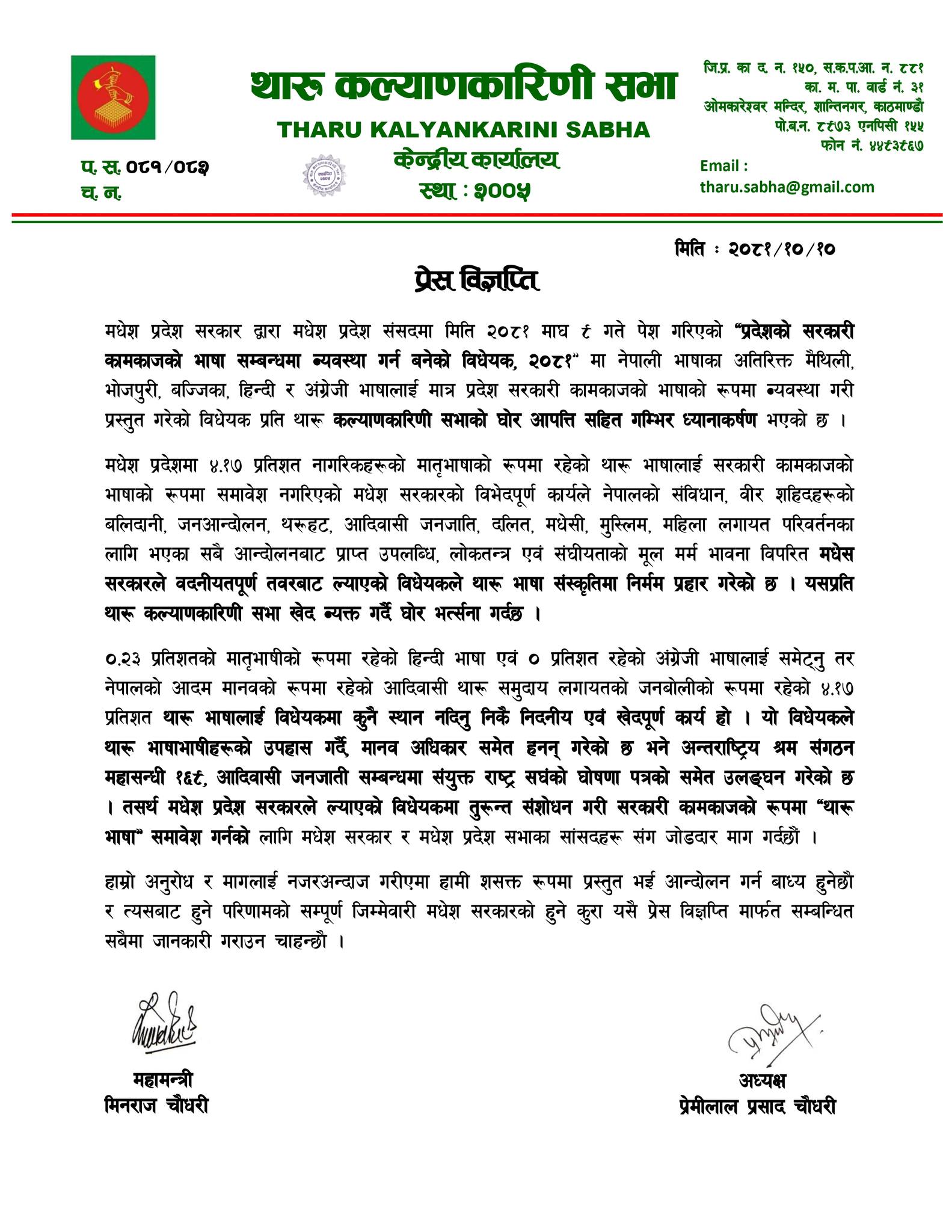 मधेश प्रदेशमा ४.१७ प्रतिशत नागरिकहरुको मातृभाषाको रुपमा रहेको थारु भाषालाई सरकारी कामकाजको भाषाको रुपमा समावेश नगरिएको मधेश सरकारको विभेदपूर्ण कार्यले नेपालको संविधान, वीर शहिदहरुको बलिदानी, जनआन्दोलन, थरुहट, आदिवासी जनजाति, दलित, मधेसी, मुस्लिम, महिला लगायत परिवर्तनका लागि भएका सबै आन्दोलनबाट प्राप्त उपलब्धि, लोकतन्त्र एवं संघीयताको मूल मर्म भावना विपरित मधेस सरकारले वदनीयतपूर्ण तवरबाट ल्याएको विधेयकले थारु भाषा संस्कृतिमा निर्मम प्रहार गरेको छ । यसप्रति थारु कल्याणकारिणी सभा खेद व्यक्त गर्दै घोर भर्त्सना गर्दछ ।