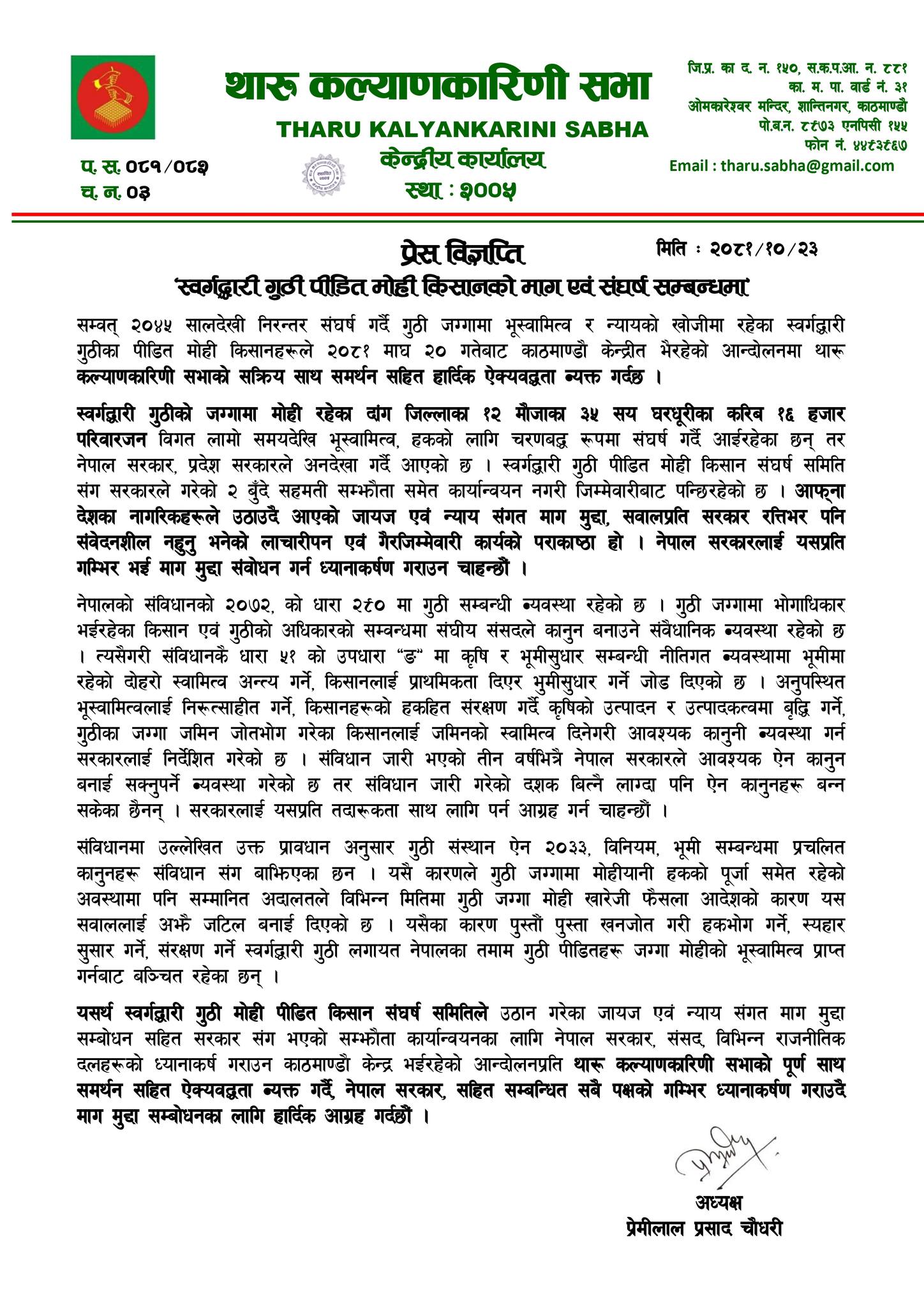 सरकारलाई थाकसले भन्यो- स्वर्गद्वारी गुठीपीडित थारूको माग पूरा गर