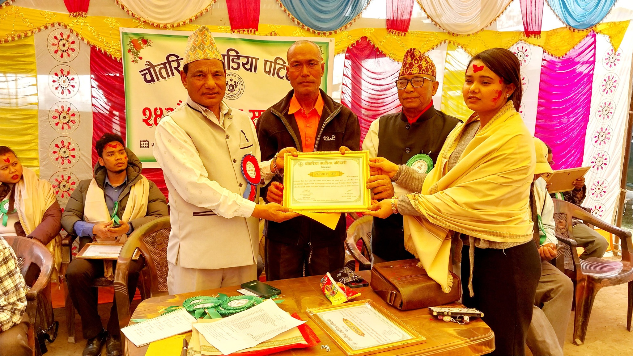 सम्मानित हुनेहरूमा माडी नगरपालिका वडा नं. ४ का मुकेश महतो, किरण थनेत, सुदिप चौधरी, रन्जित चौधरी, रेवती चौधरी तथा रत्ननगर नगरपालिका वडा नं. ८ का नितु चौधरी र सोही नगरपालिका वडा नं. ६ का छन्नु चौधरी एवम् भरतपुर महानगरपालिका वडा नं. २५ का अमृता चौधरी रहेका छन्। उनीहरुलाई प्रमुख अतिथि डा. मनोजकुमार चौधरी, अतिथि भजुमनराम महतो र पटिदारीका अध्यक्ष मागर महतोले संयुक्तरूपमा दोसल्ला ओढाएर, नगद तथा सम्मान पत्रबाट सम्मान गरिएको हो।