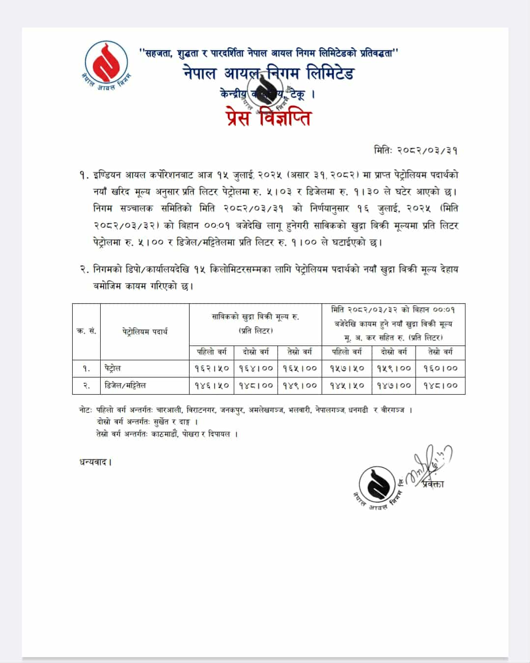 भारतमा पेट्रोल र डिजेलको मूल्य घटेर आएपछि निगमले पनि मूल्य घटाएको हो। नयाँ मूल्यसूची आज राति १२ बजेदेखि लागू हुनेछ। नयाँ मूल्यसूचीअनुसार काठमाडौं उपत्यकामा पेट्रोलको मूल्य १५० रुपैयाँ र डिजेल र मट्टितेलको मूल्य १४८ रुपैयाँ कायम भएको छ।