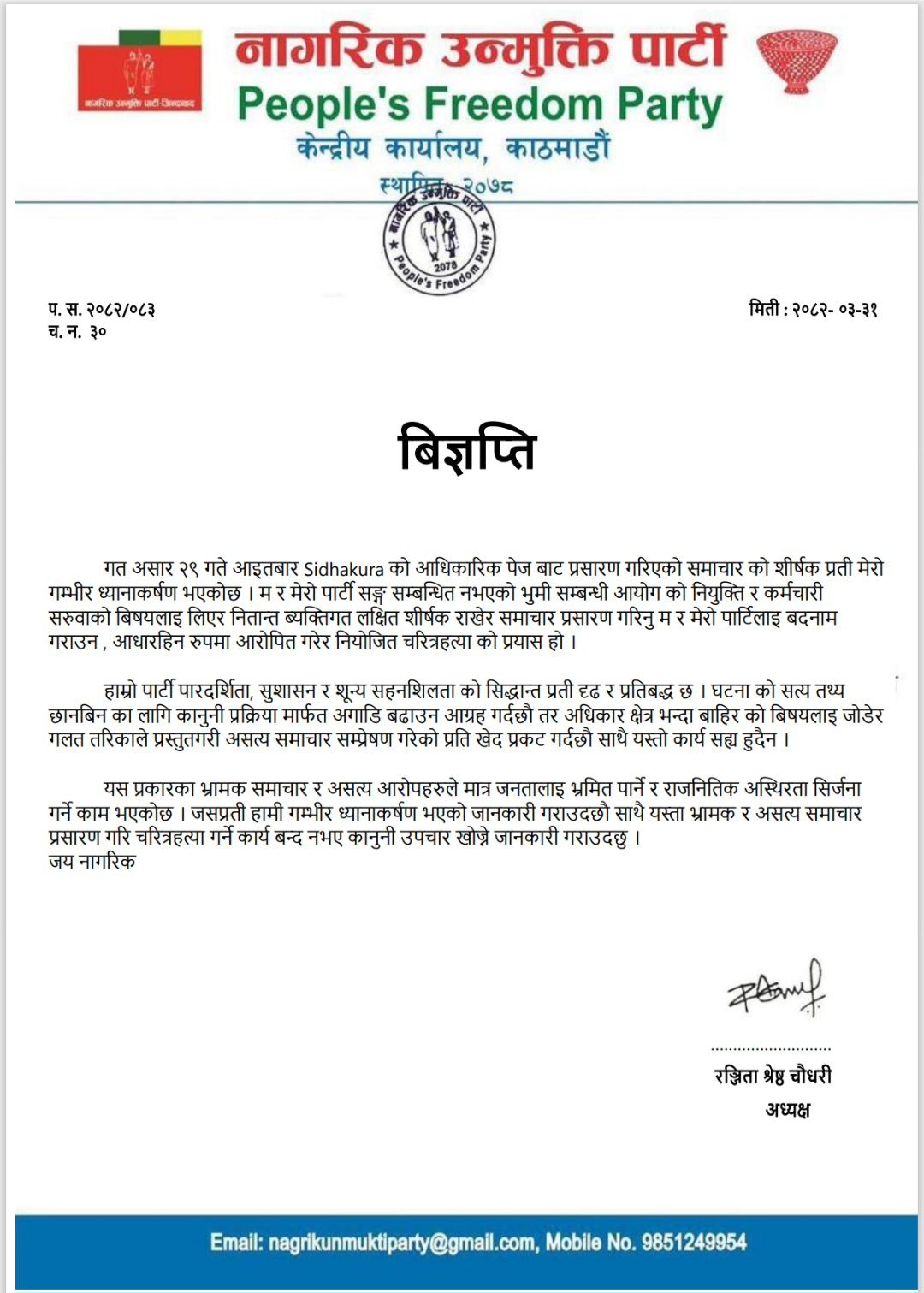 ‘गत असार २९ गते आइतबार सिधाकुराबाट प्रसारण गरिएको समाचारको शीर्षकप्रति मेरो गम्भीर ध्यानाकर्षण भएको छ। म र मेरो पार्टीसँग सम्बन्धित नभएको भूमिसम्बन्धी आयोगको नियुक्ति र कर्मचारी सरुवाको विषयलाई लिएर नितान्त ब्यक्तिगत लक्षित शीर्षक राखेर समाचार प्रसारण गरिनु म र मेरो पार्टीलाई बदनाम गराउन, आधारहीनरूपमा आरोपित गरेर नियोजित चरित्रहत्या को प्रयास हो,’ अध्यक्ष श्रेष्ठले विज्ञप्ति जारी गरेर भनेकी छन्।