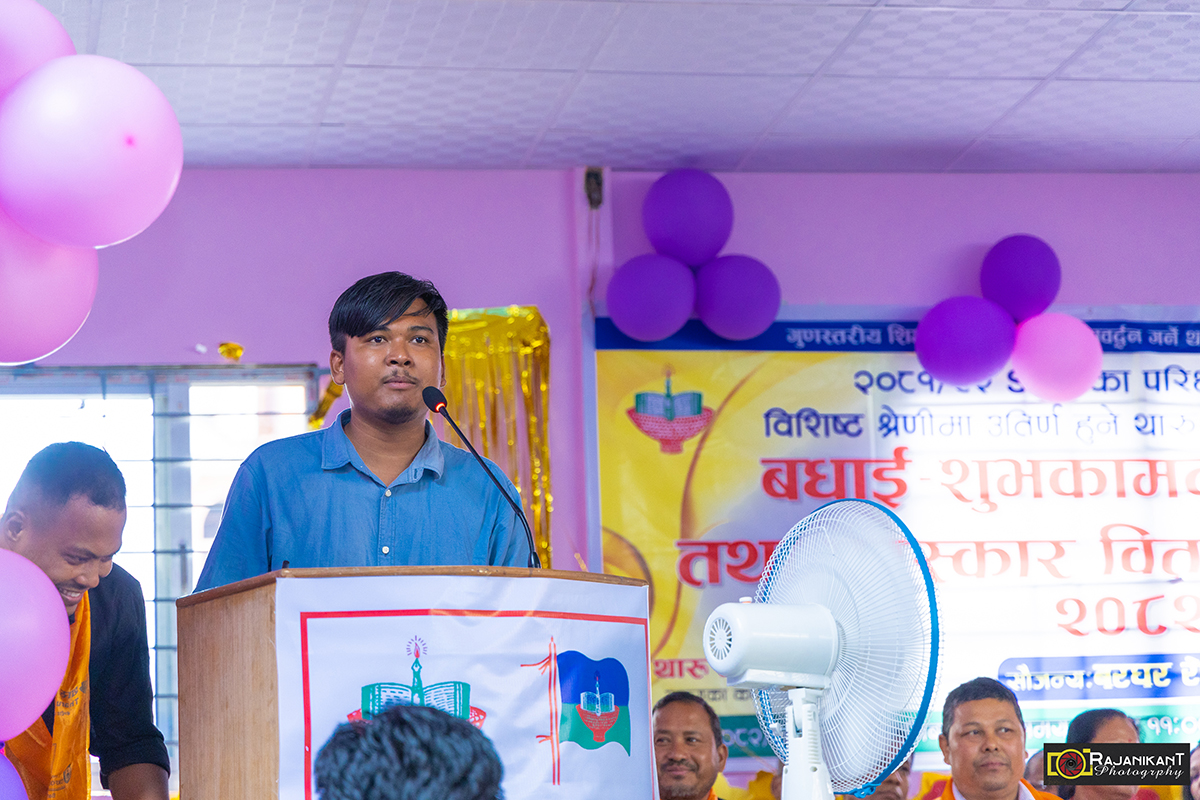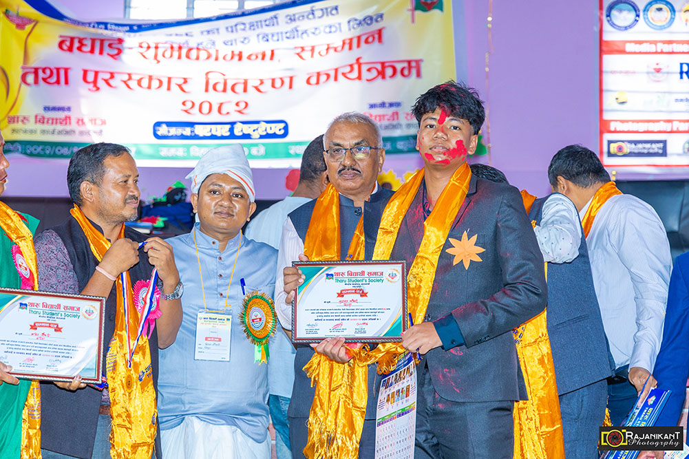 त्यस्तै कार्यक्रममा थारू विद्यार्थी समाजका पूर्व पदाधिकारीसमेत रहेका आशिषले एसईई उत्तीर्ण विद्यार्थीहरूलाई ‘मोटिभेशन स्पिच’मार्फत् प्रशिक्षित गरेका थिए। थारू विद्यार्थी समाजका अध्यक्ष विमल चौधरीले सम्मानित विद्यार्थीहरूलाई बधाई दिँदै आगामी शैक्षिक यात्राको शुभकामना दिएका थिए। कार्यक्रमलाई सम्बोधन गर्दै अध्यक्ष चौधरीले आफूहरूले उनीहरूको आगामी शैक्षिक यात्राका लागि प्रोत्साहनस्वरुप सम्मान गरेको बताएका थिए।