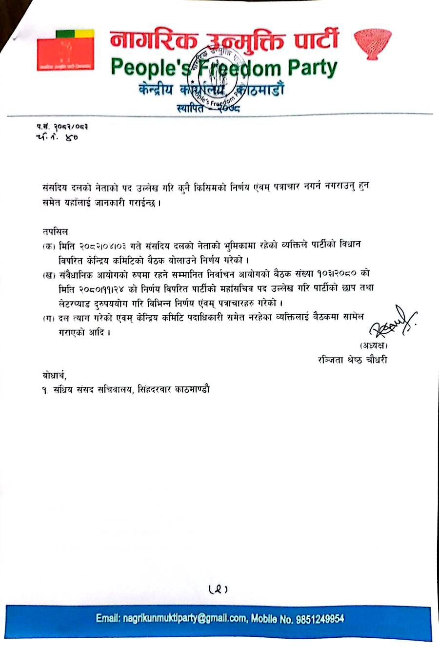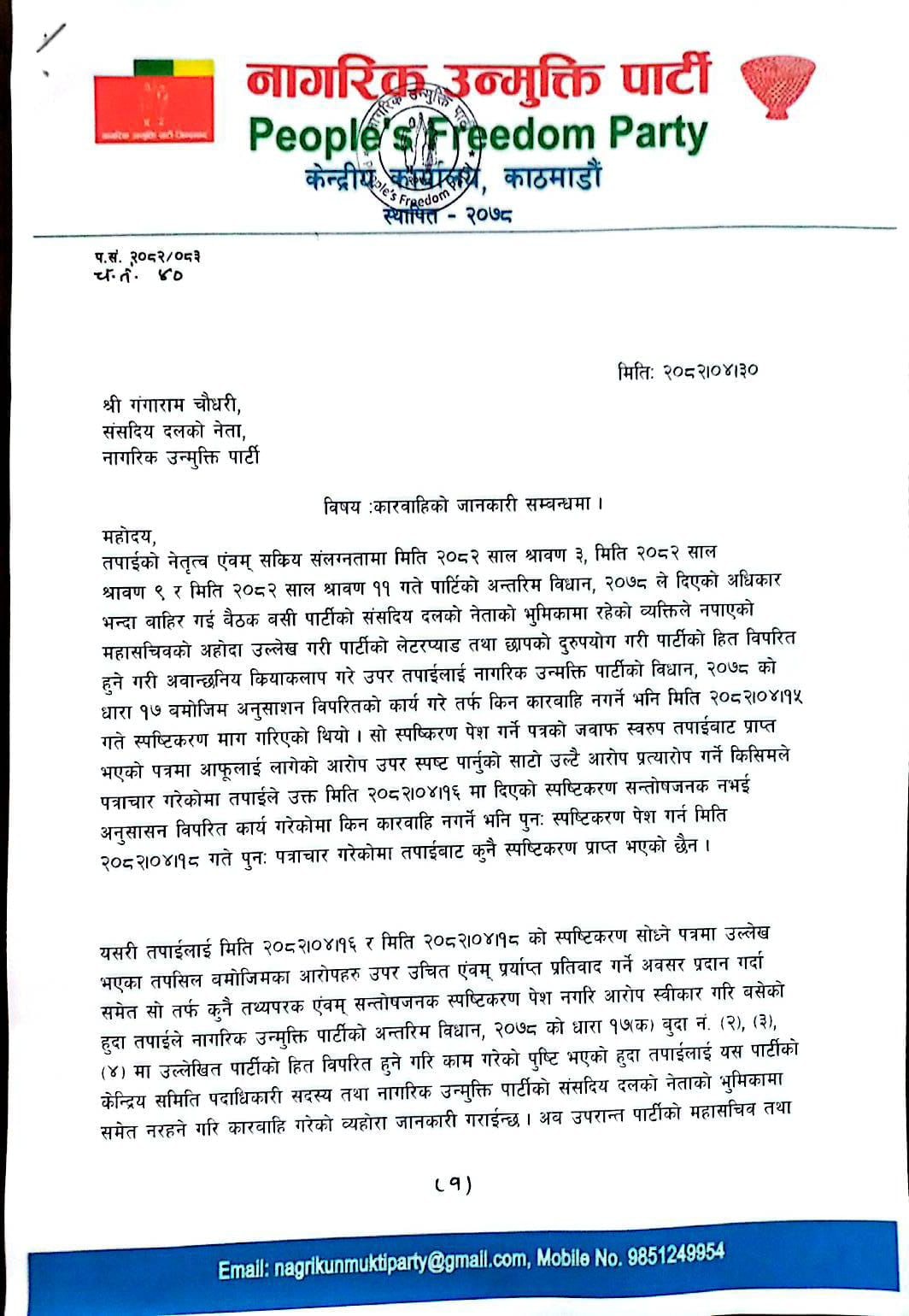 ‘पार्टीको हितविपरीत हुने गरी काम गरेको पुष्टि भएको हुँदा तपाईंलाई यस पार्टीको केन्द्रीय समिति पदाधिकारी सदस्य तथा नागरिक उन्मुक्ति पार्टीको संसदीय दलको नेताको भूमिकामा समेत नरहने गरी कारबाही गरेको व्यहोरा जानकारी गराइन्छ,’ गंगरामलाई लेखिएको पत्रमा भनिएको छ।