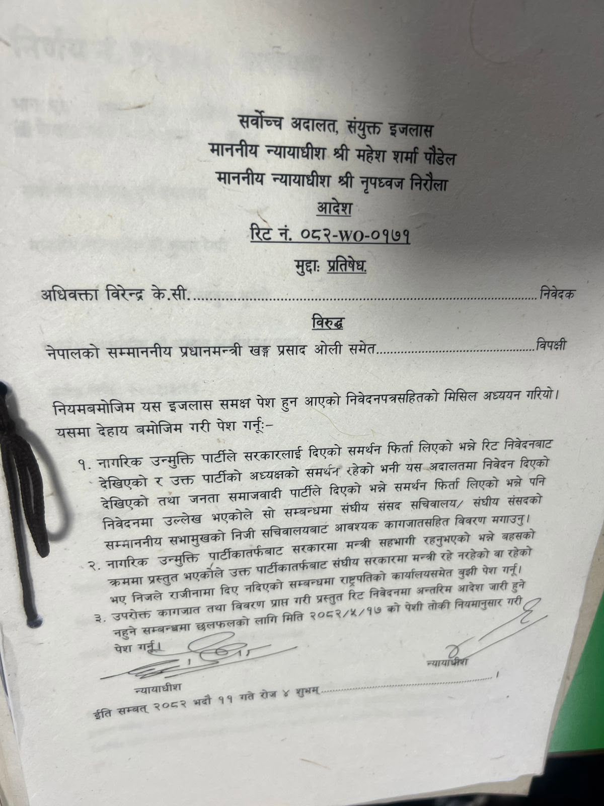 नाउपाले सरकारलाई दिएको समर्थन फिर्ता लिएको रिट निवेदनमा देखिएको तर अध्यक्ष रञ्जिता श्रेष्ठको समर्थन कायम रहेको पत्र अदालतमा पेस गरेपछि सर्वोच्चले संसद सचिवालयबाट आवश्यक कागजात माग गरेको हो। ‘नागरिक उन्मुक्ति पार्टीले सरकारलाई दिएको समर्थन फिर्ता लिएको भन्ने रिट निवेदनबाट देखिएको र उक्त पार्टीको अध्यक्षको समर्थन रहेको भनी यस अदालतमा निवेदन दिएको देखिएको तथा जनता समाजवादी पार्टीले दिएको भन्ने समर्थन फिर्ता लिएको भन्ने पनि निवेदनमा उल्लेख भएकाले सो सम्बन्धमा संघीय संसद सचिवालय/संघीय संसदको सम्माननीय सभामुखको निजी सचिवालयबाट आवश्यक कागजातसहित विवरण मगाउनु,’ आदेशमा भनिएको छ।