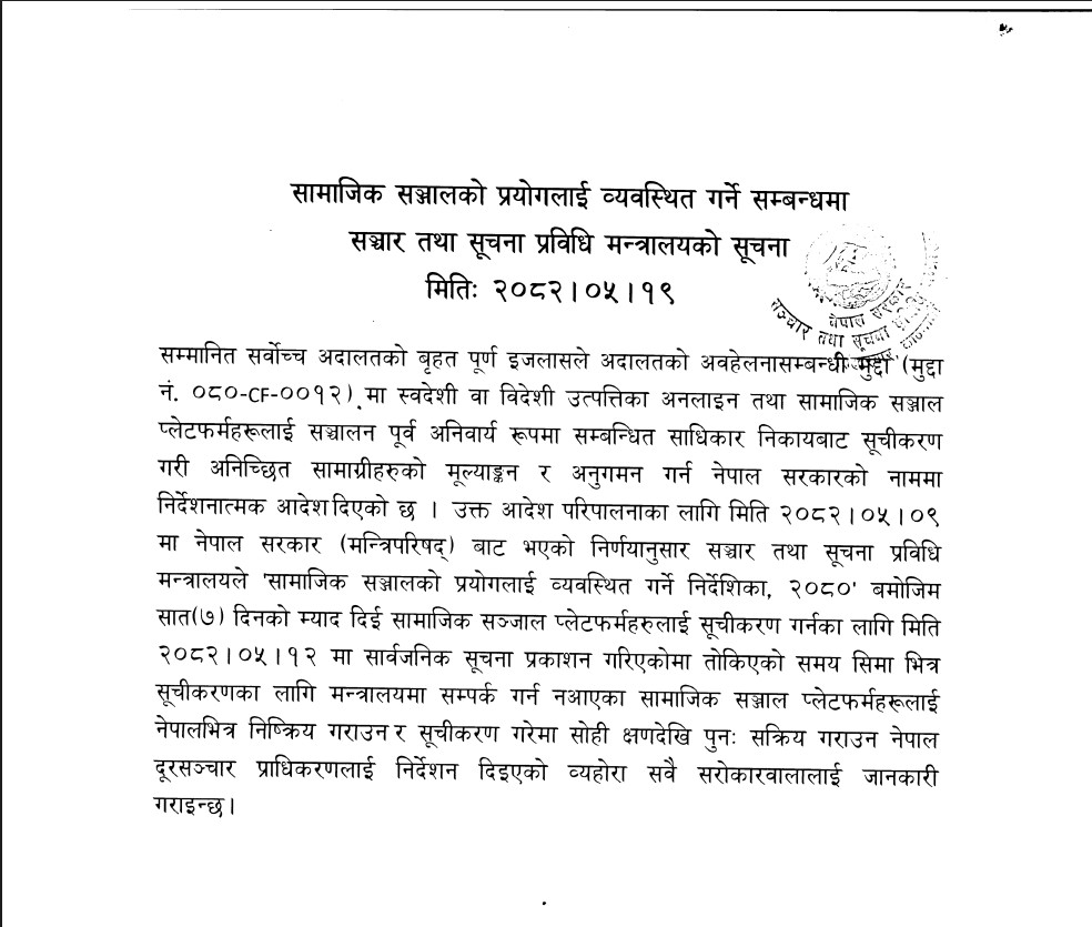 ‘सम्मानित सर्वोच्च अदालतको बृहत पूर्ण इजलासले अदालतको अवहेलनासम्बन्धी मुद्दा (मुद्दा नं. ०८०-CF-००१२) मा स्वदेशी वा विदेशी उत्पत्तिका अनलाइन तथा सामाजिक सञ्जाल प्लेटफर्महरूलाई सञ्चालन पूर्व अनिवार्य रूपमा सम्बन्धित साधिकार निकायबाट सूचीकरण गरी अनिच्छित सामाग्रीहरुको मूल्याङ्कन र अनुगमन गर्न नेपाल सरकारको नाममा निर्देशनात्मक आदेश दिएको छ। उक्त आदेश परिपालनाका लागि मिति २०८२।०५।०९ मा नेपाल सरकार (मन्त्रिपरिषद्) बाट भएको निर्णयानुसार सञ्चार तथा सूचना प्रविधि मन्त्रालयले ‘सामाजिक सञ्जालको प्रयोगलाई व्यवस्थित गर्ने निर्देशिका, २०८० बमोजिम सात (७) दिनको म्याद दिई सामाजिक सञ्जाल प्लेटफर्महरुलाई सूचीकरण गर्नका लागि मिति २०८२।०५।१२ मा सार्वजनिक सूचना प्रकाशन गरिएकोमा तोकिएको समय सिमा भित्र सूचीकरणका लागि मन्त्रालयमा सम्पर्क गर्न नआएका सामाजिक सञ्जाल प्लेटफर्महरूलाई नेपालभित्र निष्क्रिय गराउन र सूचीकरण गरेमा सोही क्षणदेखि पुनः सक्रिय गराउन नेपाल दूरसञ्चार प्राधिकरणलाई निर्देशन दिइएको व्यहोरा सबै सरोकारवालालाई जानकारी गराइन्छ,’ मन्त्रालयद्वारा जारी विज्ञप्तिमा भनिएको छ।